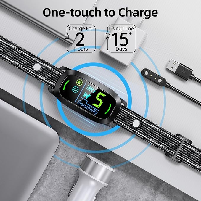 The bark collar for medium dogs features new charging for simple operation and more stable charging. A full charge in 2 hours works for about 15 days. The bark collar for large dogs has an IP67 waterproof design, so you can enjoy training time with your dog in the pool, park, beach, or backyard  Our dog bark collar is adjustable for dogs weighing 8 to 120 lbs with neck sizes of 8 to 25 inches, making it adjustable as your dog growsÂ